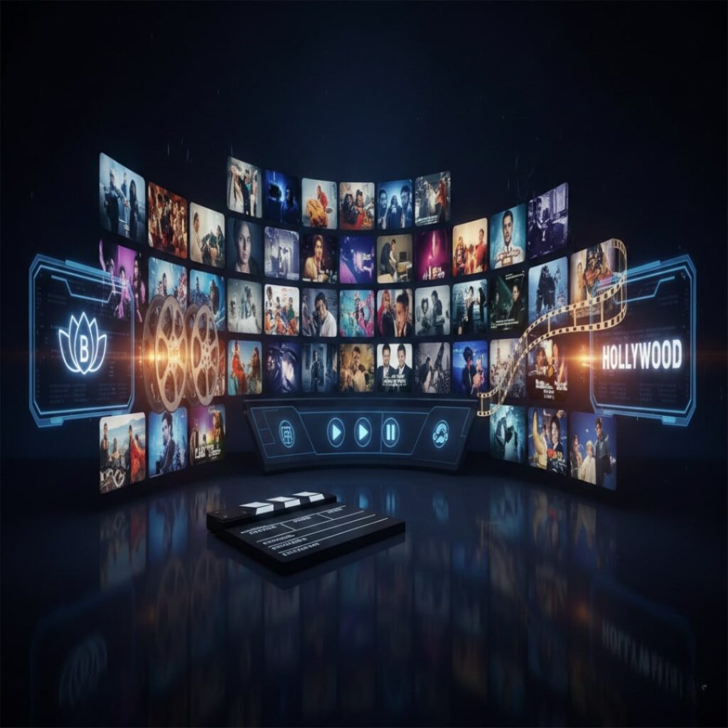 Cinematic digital wall displaying Bollywood and Hollywood movie and TV show thumbnails with film reels, streaming icons, and a modern entertainment interface on a dark background.